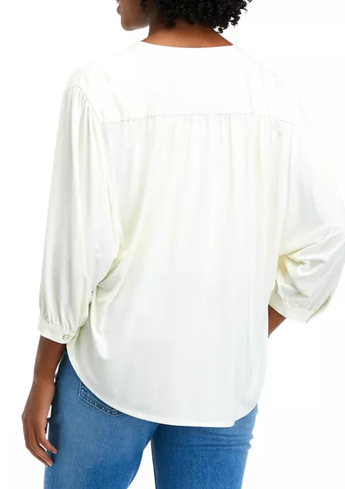 Hitting above the hip, this soft, drapey blouse from Biltmore® features ties at the neck with tassels.