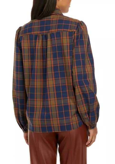 This 70s style plaid blouson sleeve collared button-down shirt from Biltmore® will have you feeling groovy. Pair with a pair of brown leather pants or denim bell bottoms for ultimate style.