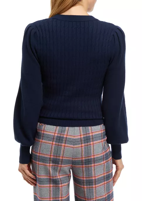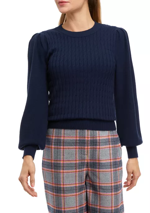 Built with feminine mini cable detailing on the body, this Biltmore® sweater features balloon sleeves with slight puff shoulders and rib trim at the hem, cuffs, and neckline.